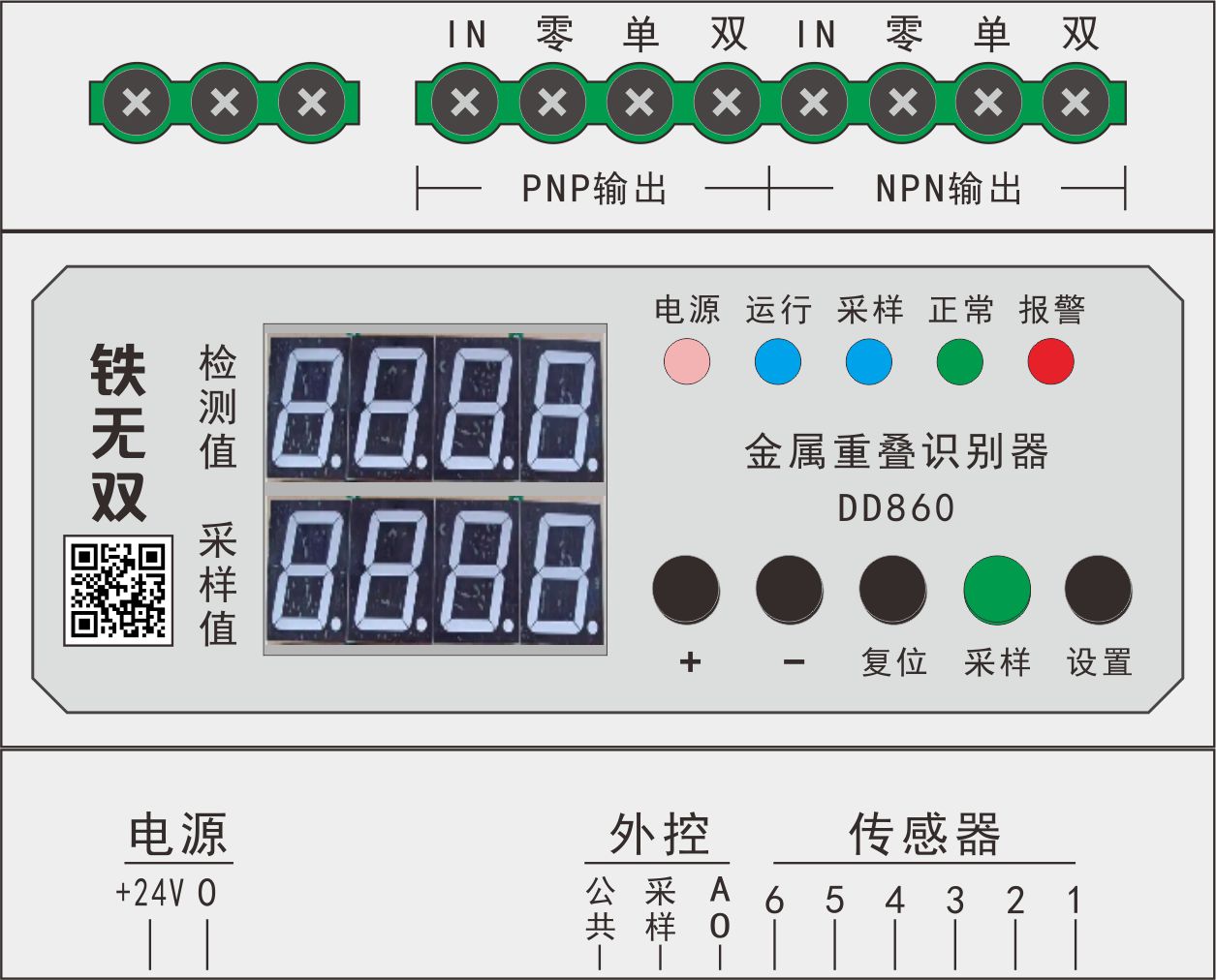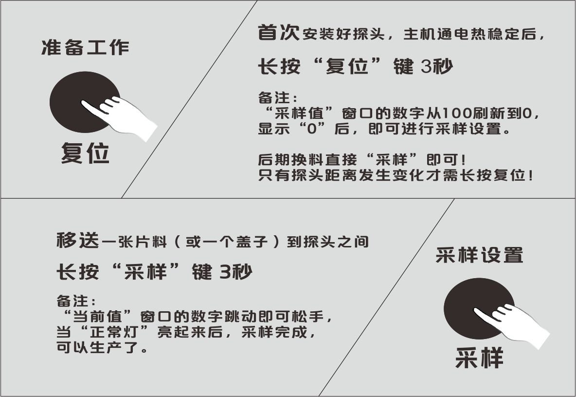 1、一键设定 “傻瓜”式一键自动采样设定,操作简单快捷高效。 2、可检测全金属系列材料 对带磁和不带磁的全金属自动识别和采样。 3、材质检测厚度范围广 从0.01-10.0mm,更薄更厚的材质都不用改变探头距离。 4、响应速度快 检测信号响应速度快,可达1200 pcs/min。 5、传感器距离变化或断线时,能够自诊报警和输出,电源正负极防接错保护。